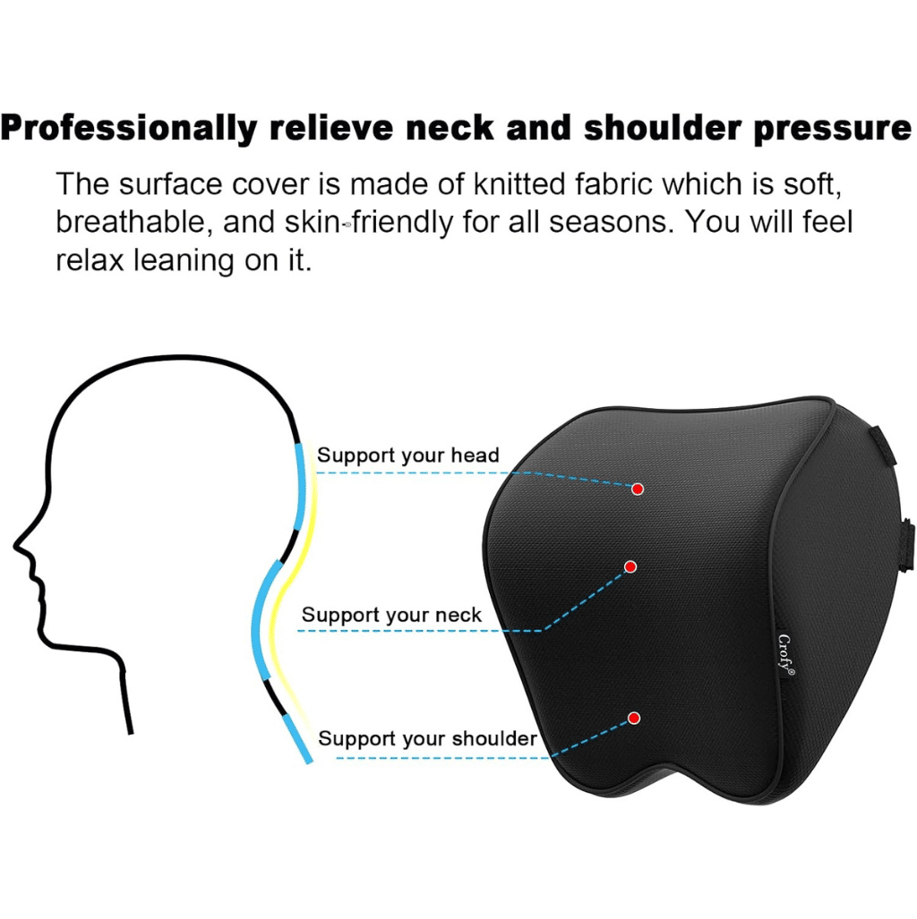 - Premium Memory Foam: The CrofY neck pillow is made with 100% high-density memory foam, offering optimal softness and support. It adapts perfectly to your neck contours, providing relief from pain and pressure spots during long drives.