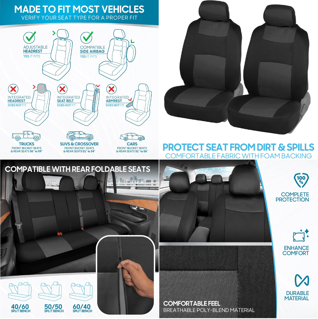 - Premium Material: Made with durable PolyPro fabric, these seat covers offer a smooth, comfortable surface while safeguarding your seats from spills, stains, dirt, and fading.