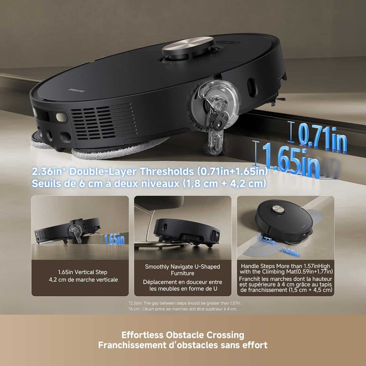 Climbs door tracks and small steps up to 6 cm with ease. No stops, no stress.- Smart, Safe Navigation