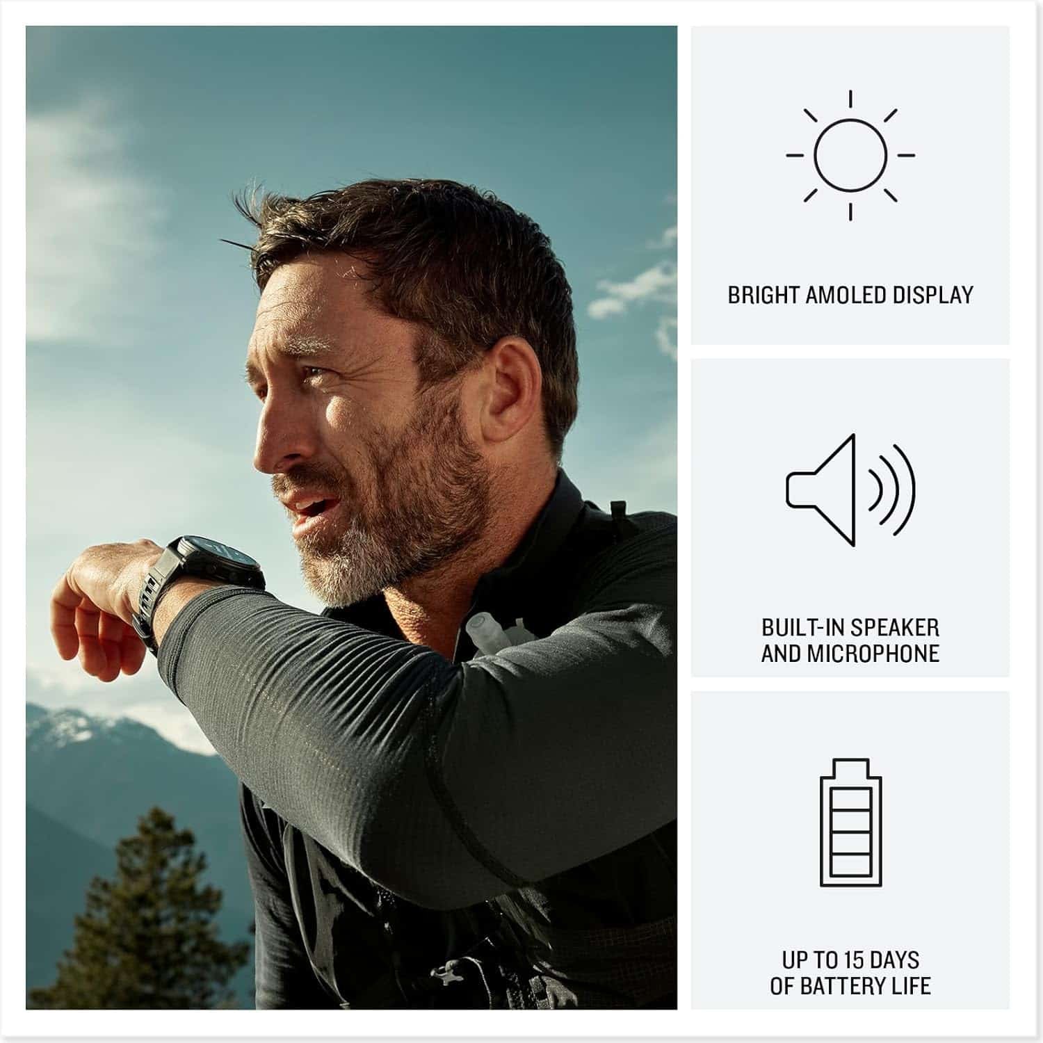 - A multisport GPS smartwatch with built-in inReach satellite and LTE connectivity for two-way messaging and calls (subscription required; coverage may vary).