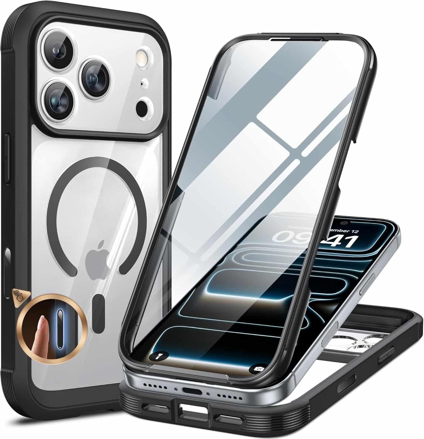 This full-body case wraps your phone in strong, clear defense. It has a built-in glass screen protector to stop scratches and cracks. A full camera cover shields your lenses while keeping photos sharp. The slim frame snaps on fast and stays tight.